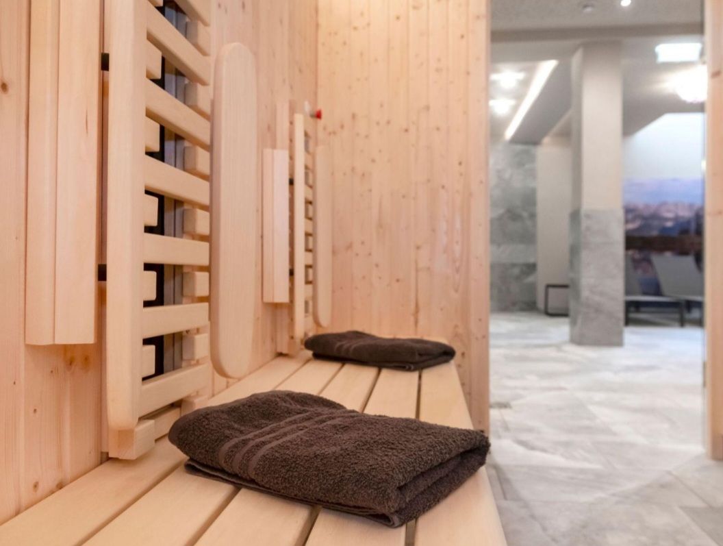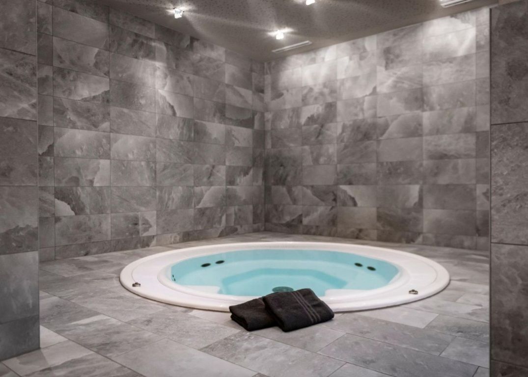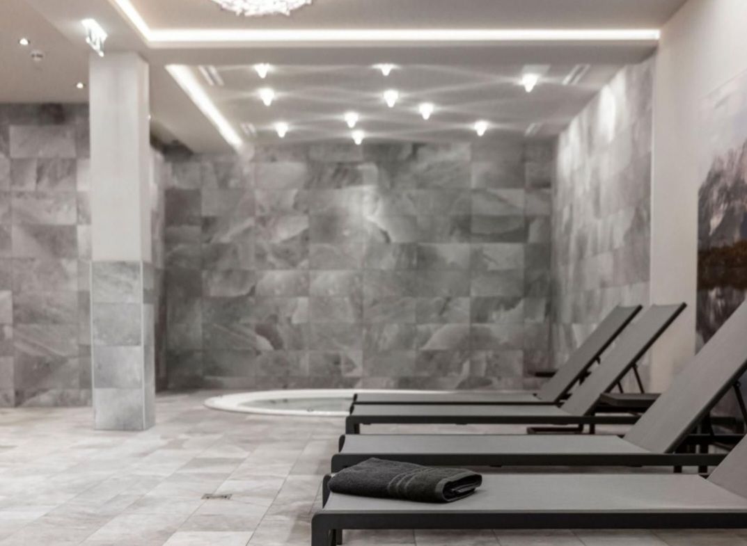 De sauna heeft een 30x60 rock salt grey tegel gekregen, met daarbij een R11 antislip vloer voor een veilige en luxueuze spa-ervaring.