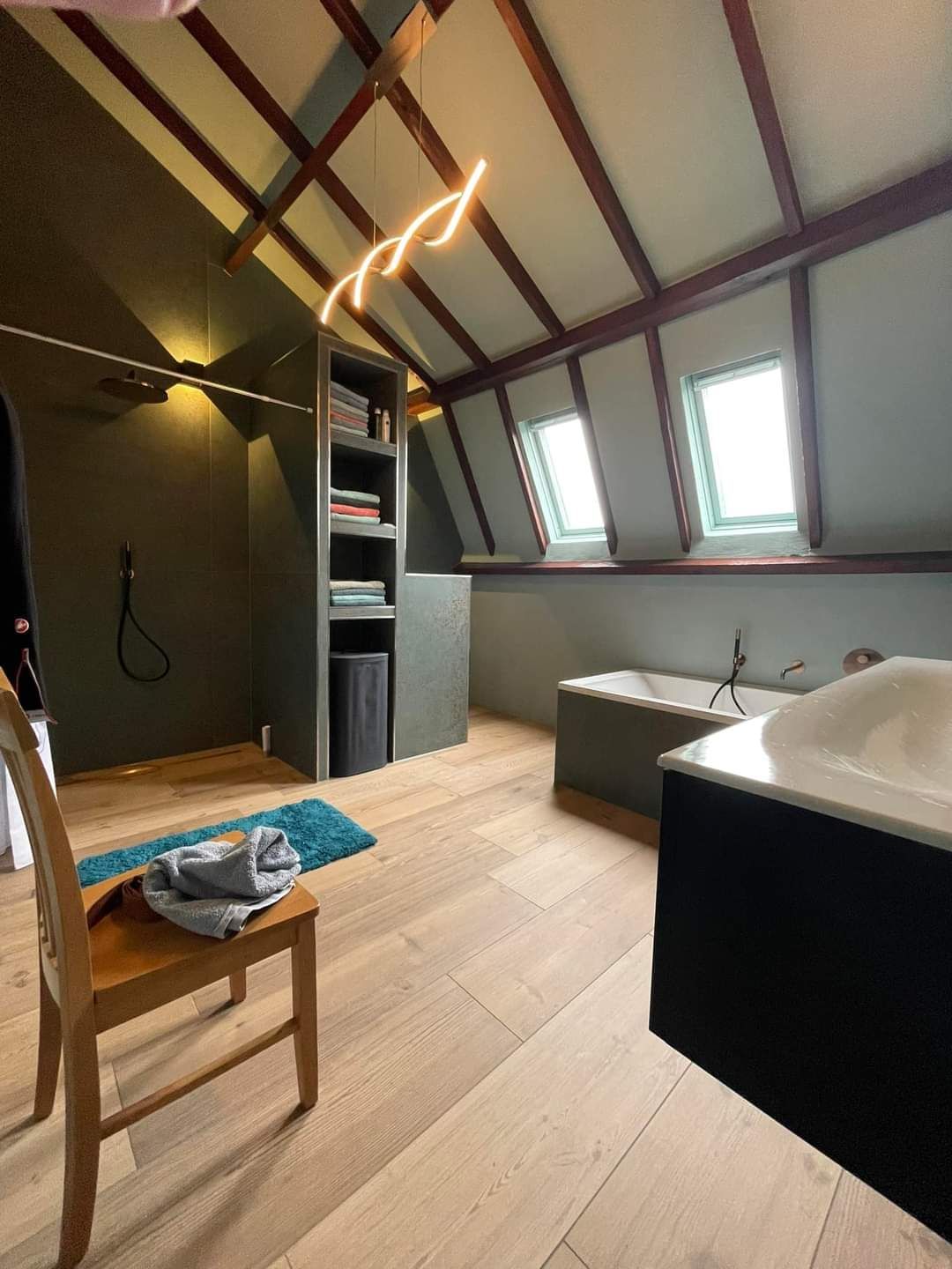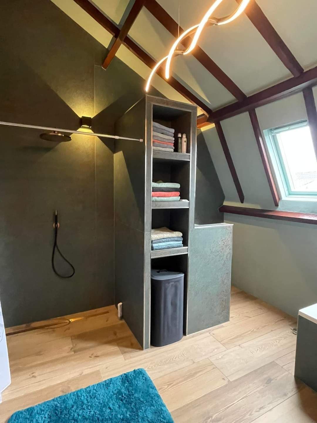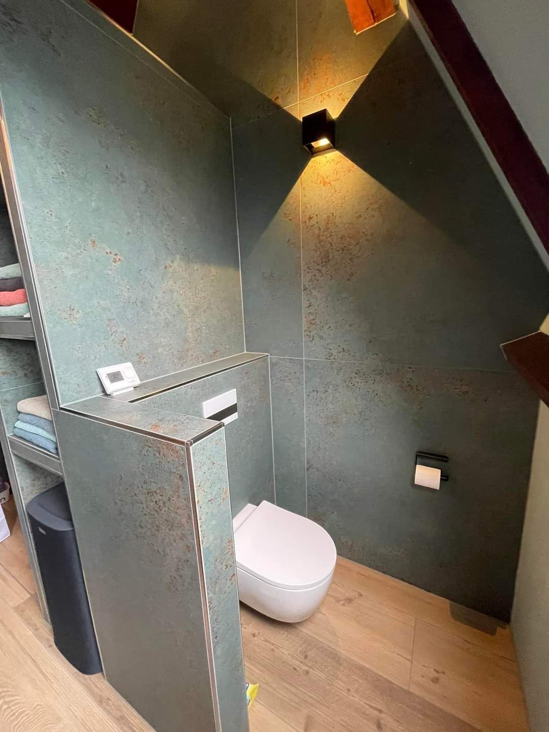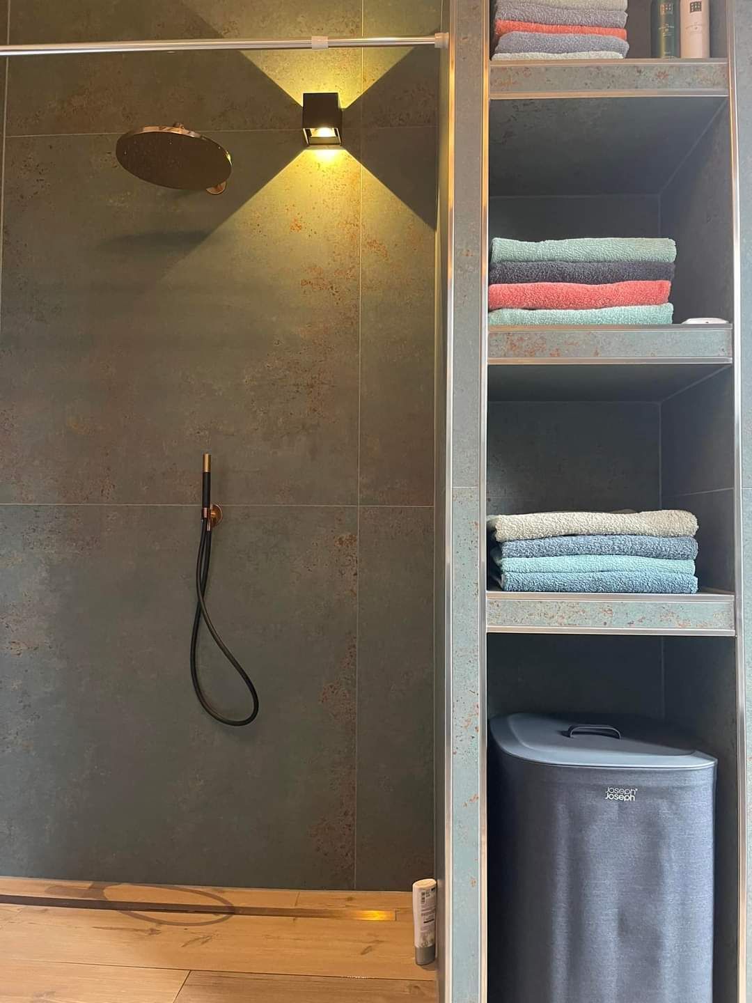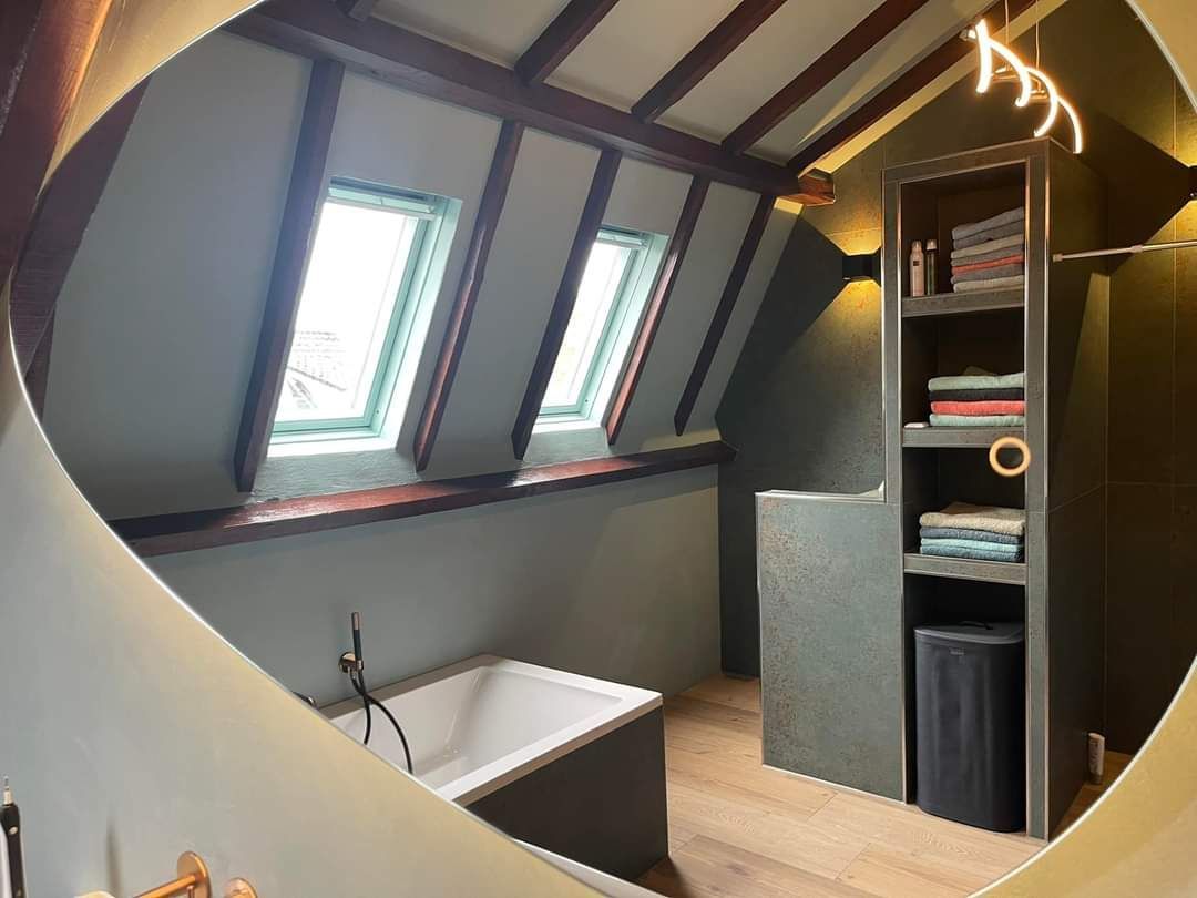 De badkamer in Azewijn is een oase van rust en elegantie. De vloer is voorzien van prachtige 30x120 Larch rtt tegels, die een warme en natuurlijke uitstraling aan de ruimte geven. De wanden zijn bekleed met 120x120 Metal Oxide tegels, waardoor een eigentijdse en industriële sfeer wordt gecreëerd. De combinatie van deze tegels resulteert in een badkamer die zowel stijlvol als functioneel is, waardoor het een plek is waar ontspanning en schoonheid samenkomen.