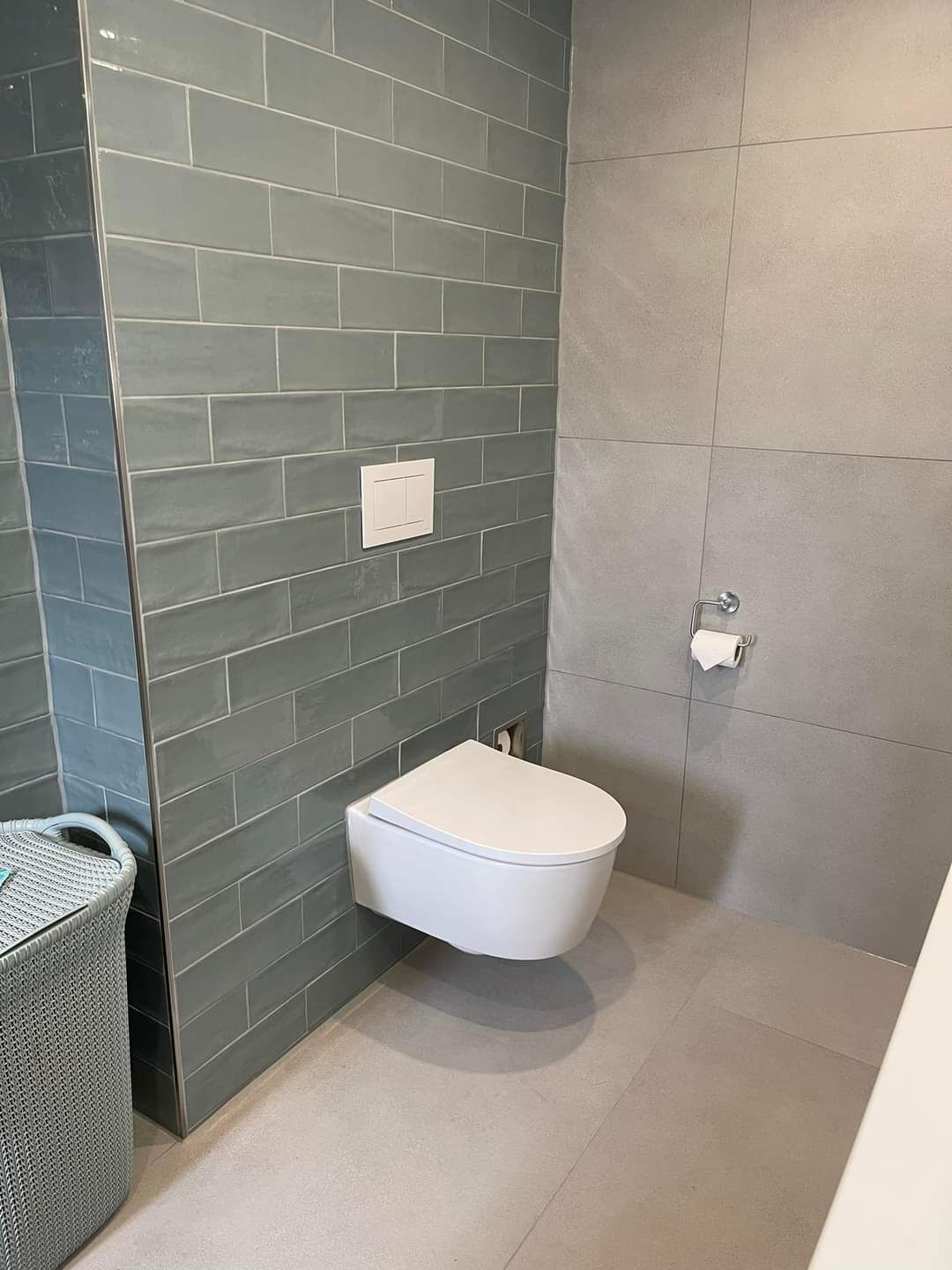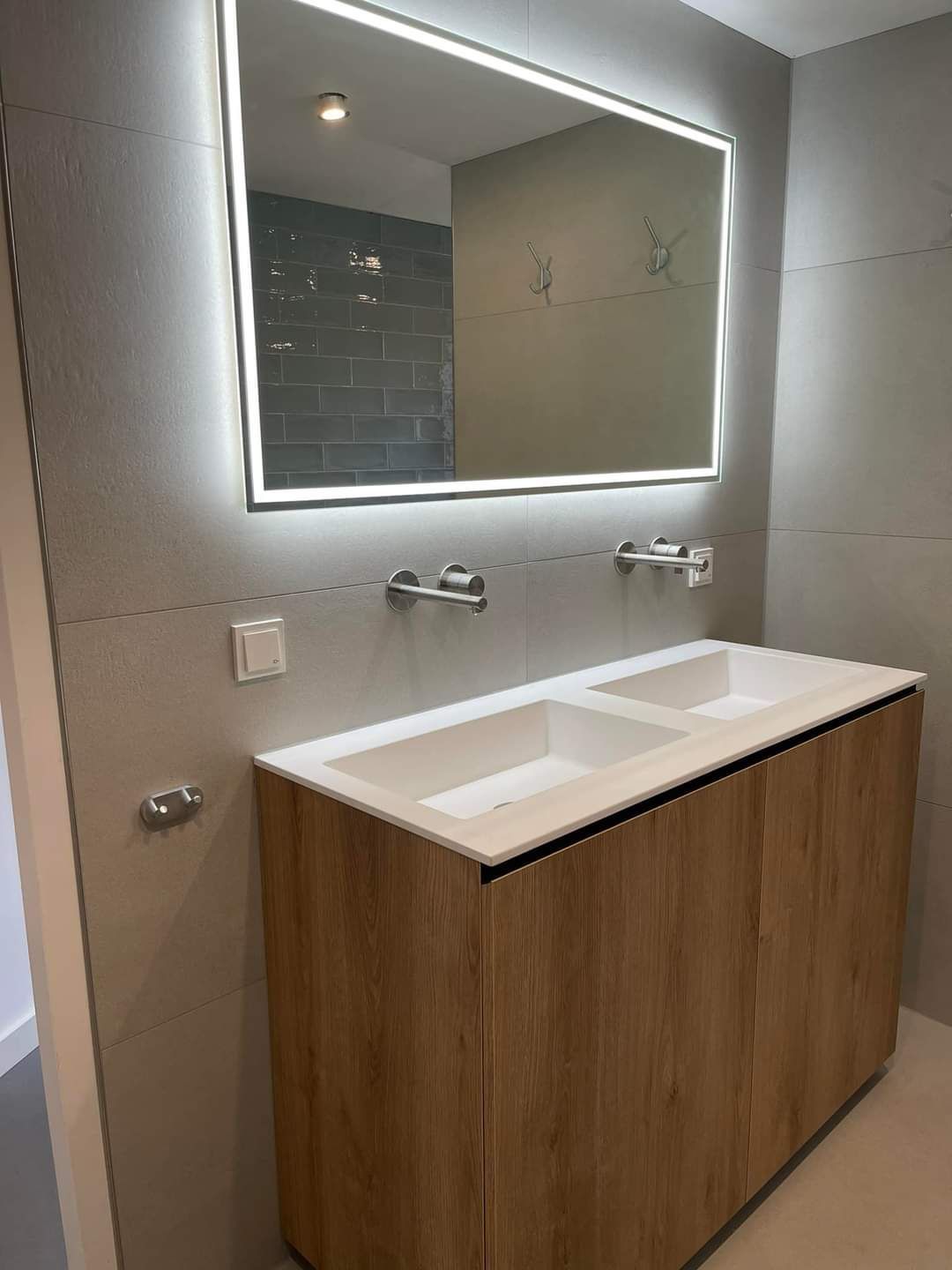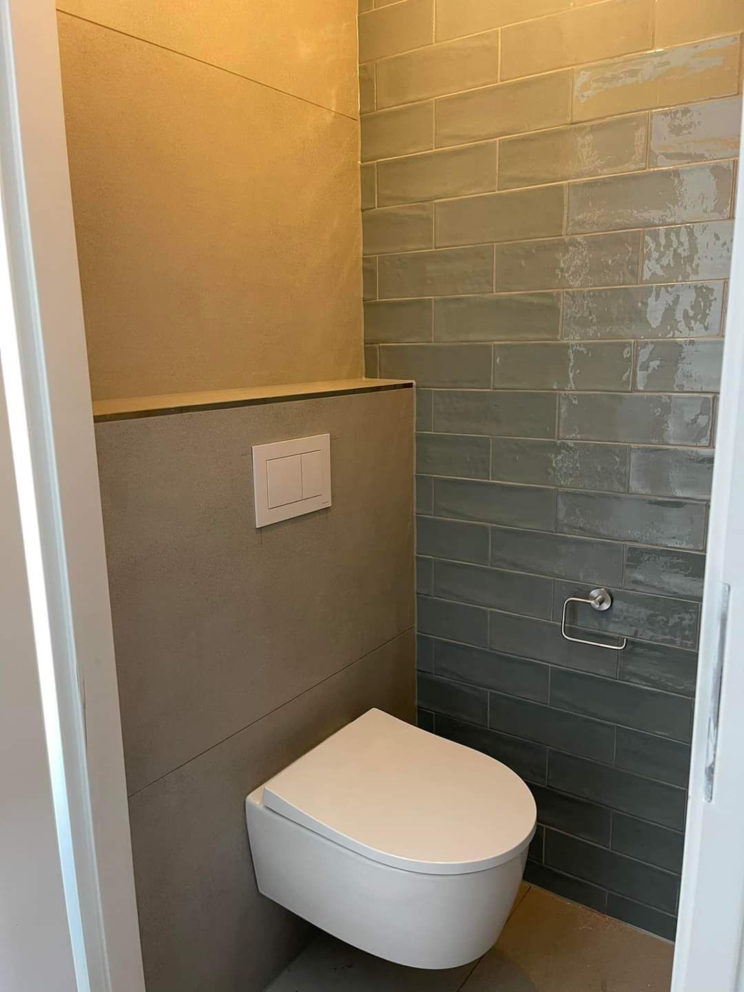 De badkamer in de woning in Zutphen is een toonbeeld van eigentijdse elegantie. De wanden zijn verfraaid met een combinatie van 10x30 Belveder Cidar tegels en 60x120 Sable cement tegels, wat een boeiende textuur en visuele variatie aan de ruimte toevoegt. De vloer is gelegd met 60x120 Sable cement tegels, waardoor een harmonieus en eigentijds geheel ontstaat. Deze badkamer is zowel stijlvol als functioneel.