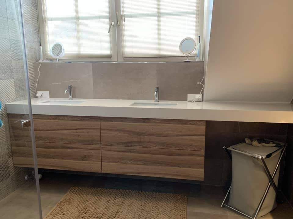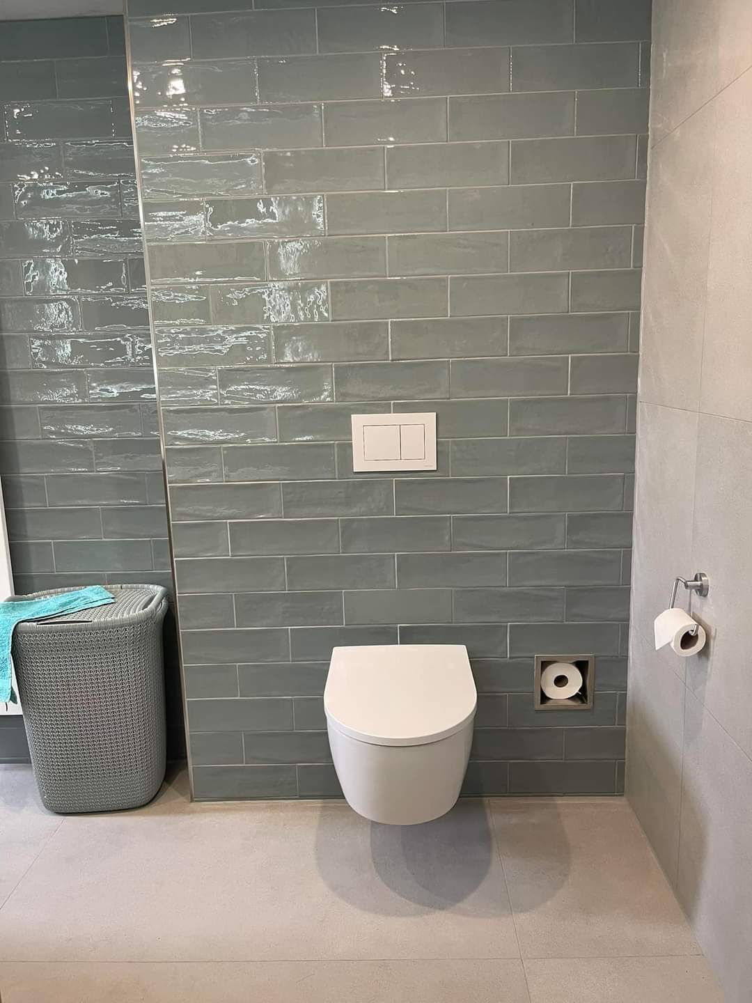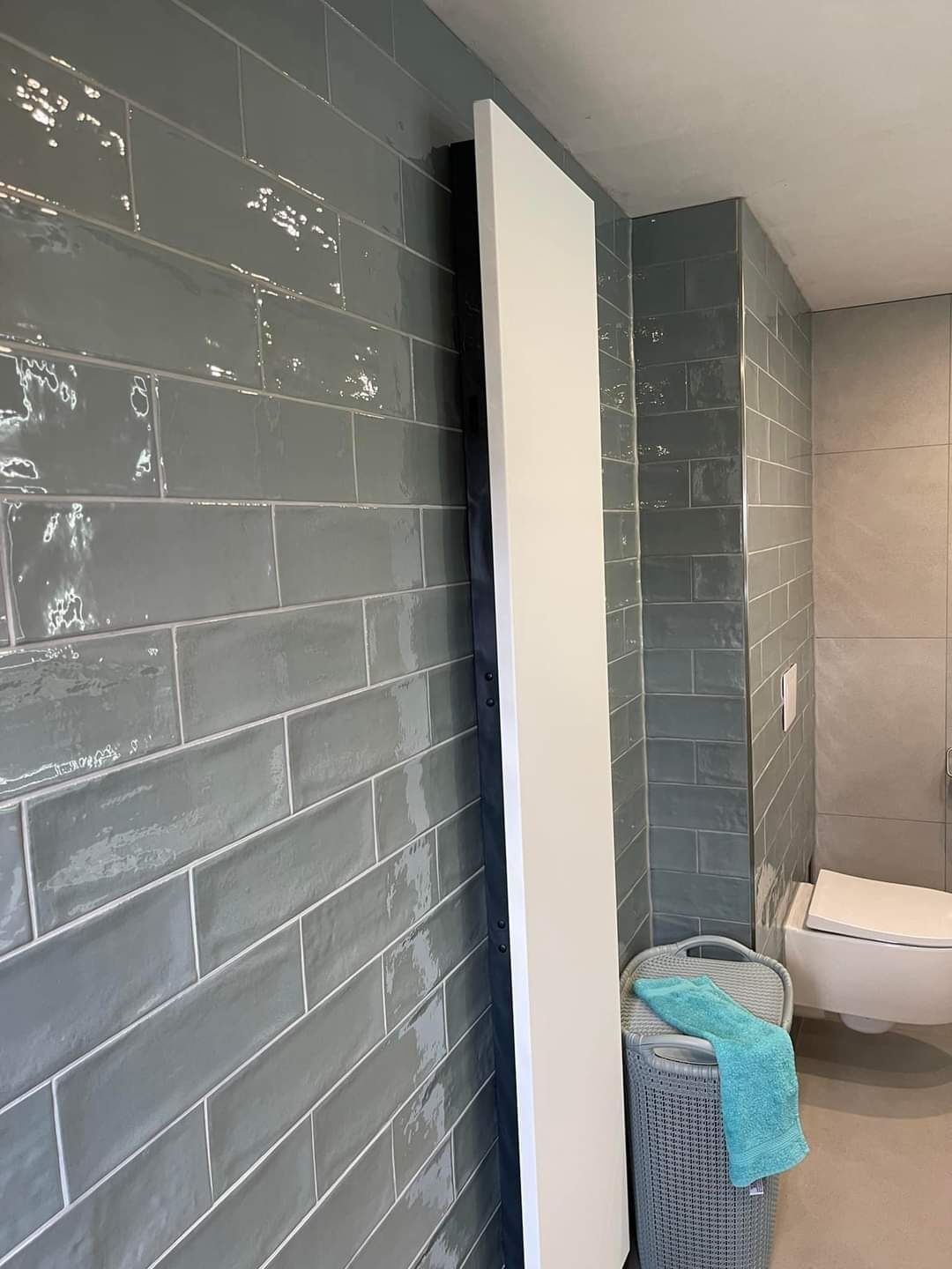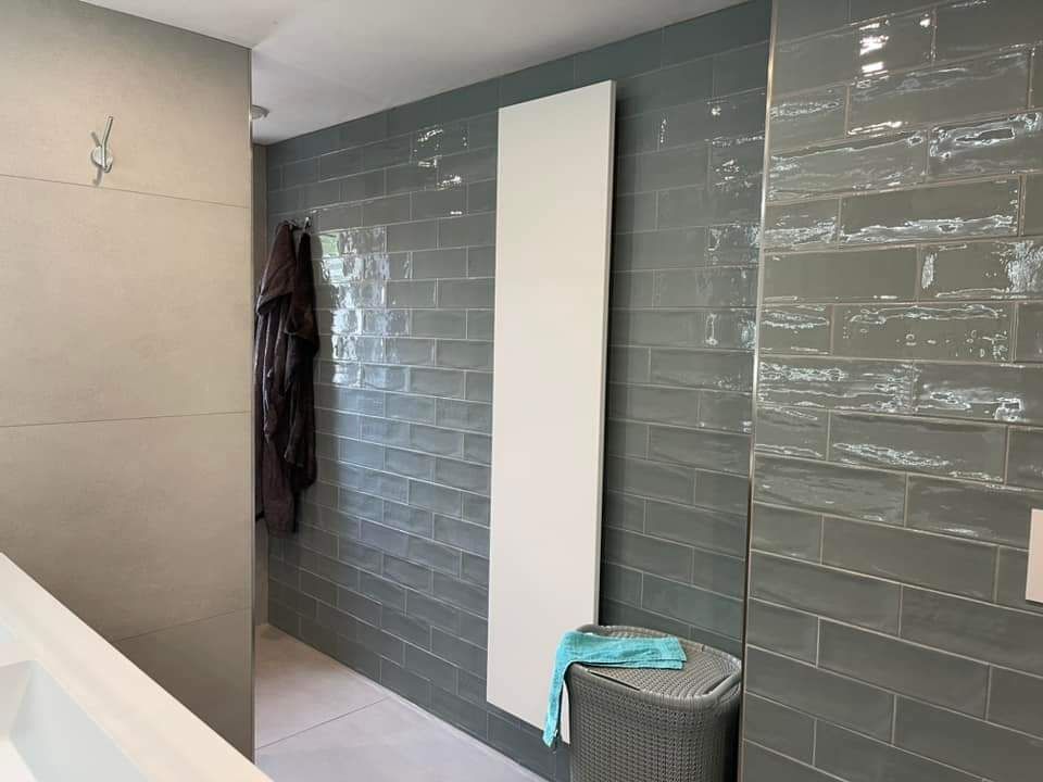 De badkamer in de woning in Zutphen is een toonbeeld van eigentijdse elegantie. De wanden zijn verfraaid met een combinatie van 10x30 Belveder Cidar tegels en 60x120 Sable cement tegels, wat een boeiende textuur en visuele variatie aan de ruimte toevoegt. De vloer is gelegd met 60x120 Sable cement tegels, waardoor een harmonieus en eigentijds geheel ontstaat. Deze badkamer is zowel stijlvol als functioneel.